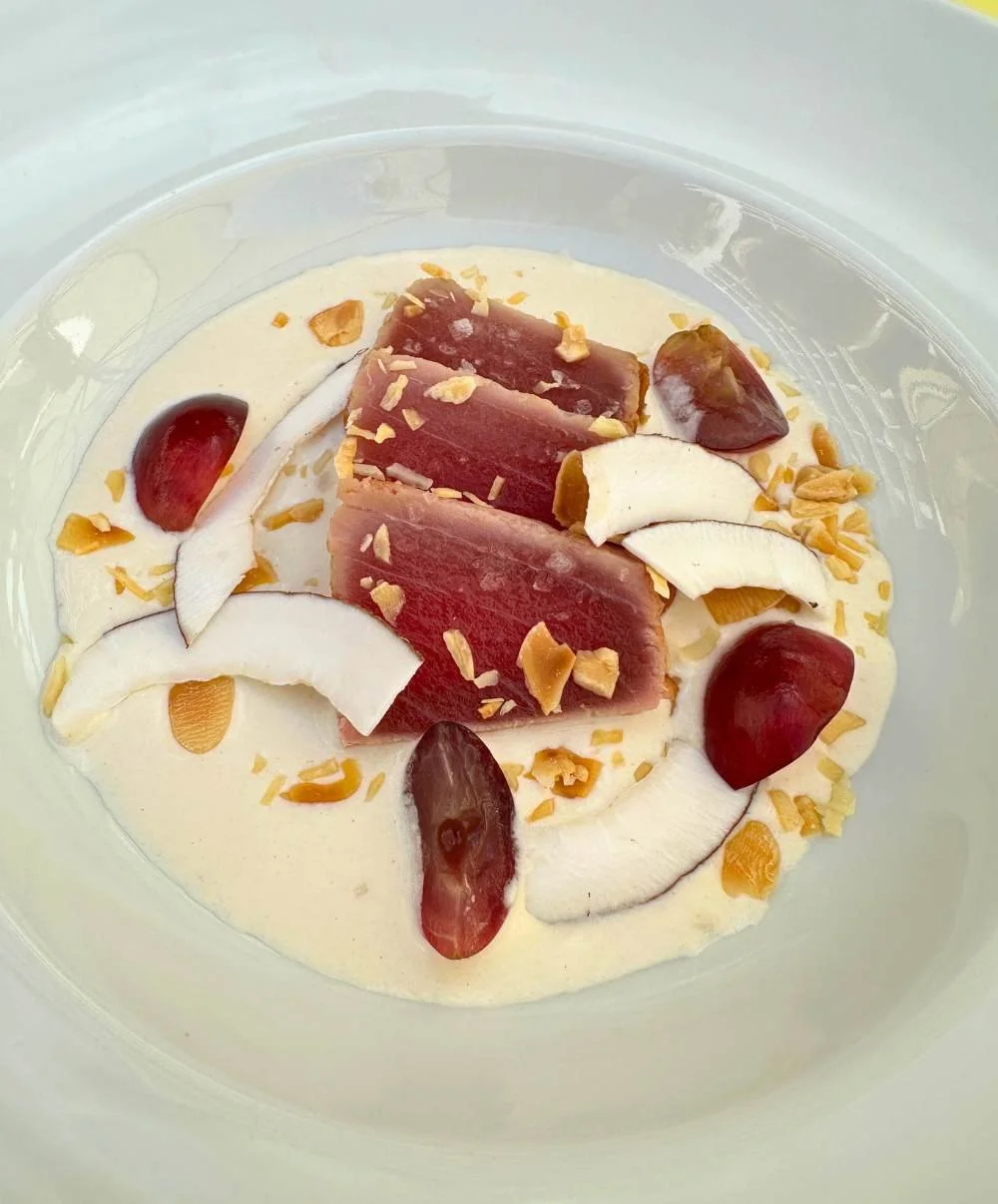 Tuna tataki with coconut, almonds and grapes, in the restaurant of the Seaside Palm Beach Hotel in Maspalomas